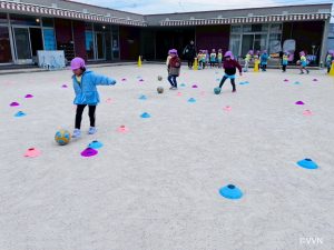 ドリブルで運びながら笛に合わせて止まったりして皆で楽しみながらプレーしました!