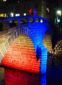 眼鏡橋もV・ファーレンカラーにライトアップされています