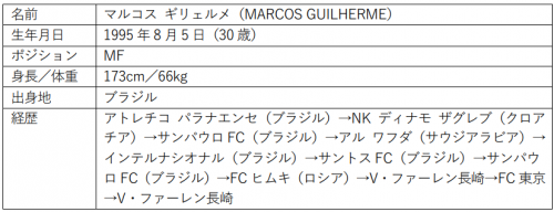 V・ファーレン長崎は、FC東京に期限付き移籍しておりましたマルコス ギリェルメ選手が同クラブの期限付き移籍期間満了およびジョホール・ダルル・タクジム FC(マレーシア)へ完全移籍することが決まりましたので、お知らせいたします。