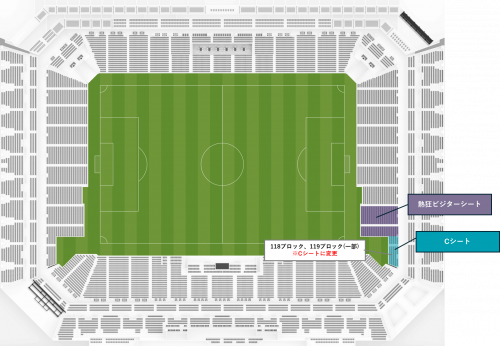 118ブロック、119ブロック(一部)の熱狂ビジターシート(自由席)をCシートに変更いたします。