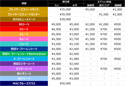 追加料金に関しては、席種によって異なるため、価格表をご確認ください。