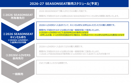 V-LOVERS会員を対象に、2026-27シーズンのSEASONSEAT販売の際に2026SEASONSEAT販売座席に空きが出た場合空いたお席を優先的にご購入いただけます。
