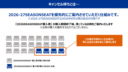 上記販売状況を踏まえて、2026-27シーズンのSEASONSEATのキャンセル待ちの受付を開始いたします。